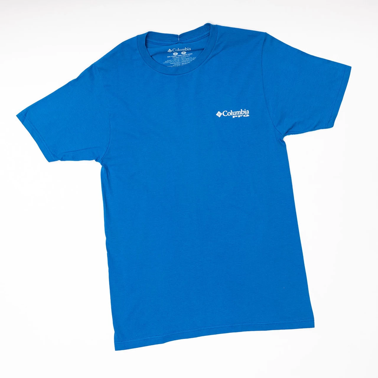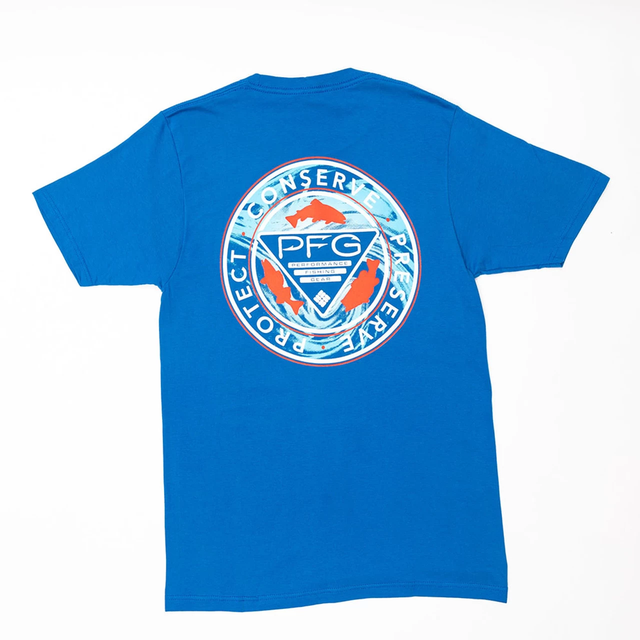 Hit the sea with the men’s PFG tee featuring Conserve, Protect, and Preserve in a colorful swirl.