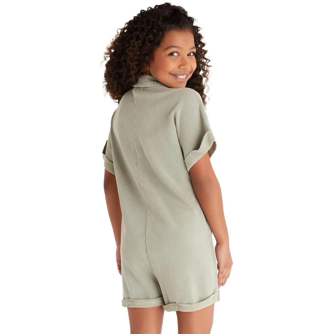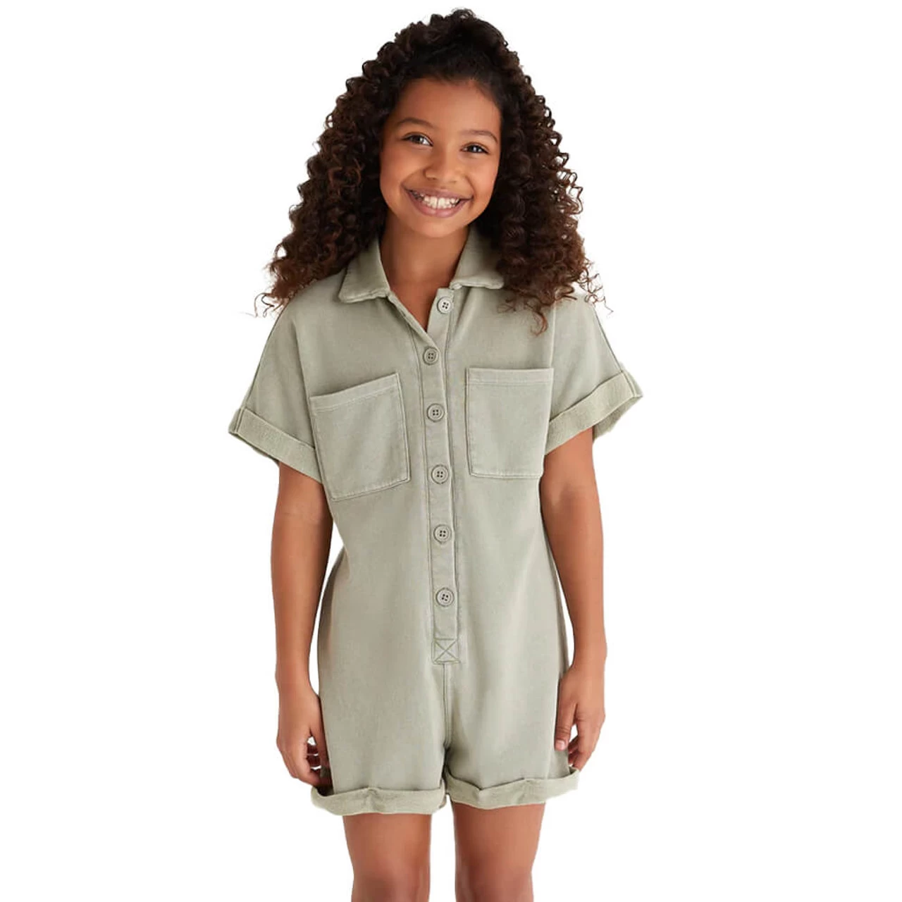 Made from Cotton French Terry knit fabric, this romper has a relaxed fit. Its features are a collared, button-up design and wide sleeves and leg holes that are rolled giving it a functional vibe. Featuring front chest pockets.