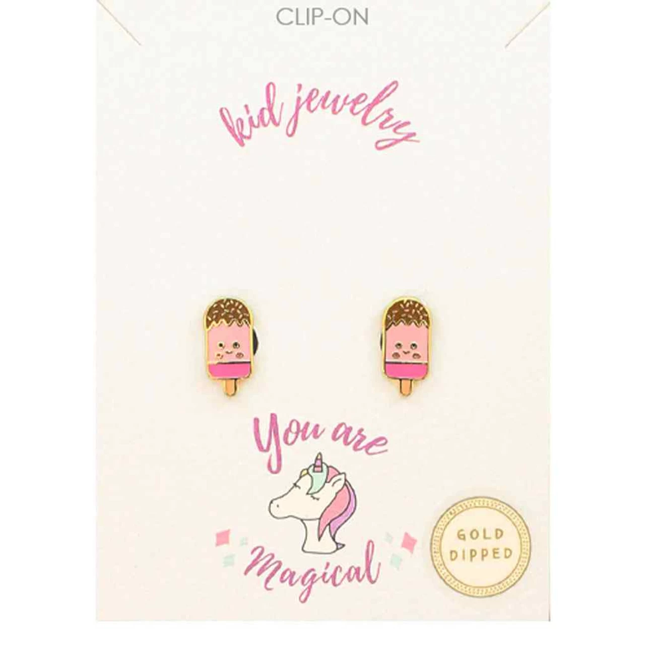 These clip-on earrings are perfect for kids who don’t have their ears pierced. Gold dipped and featuring a smiley ice cream bar, these earrings are adorable. They make a perfect gift.