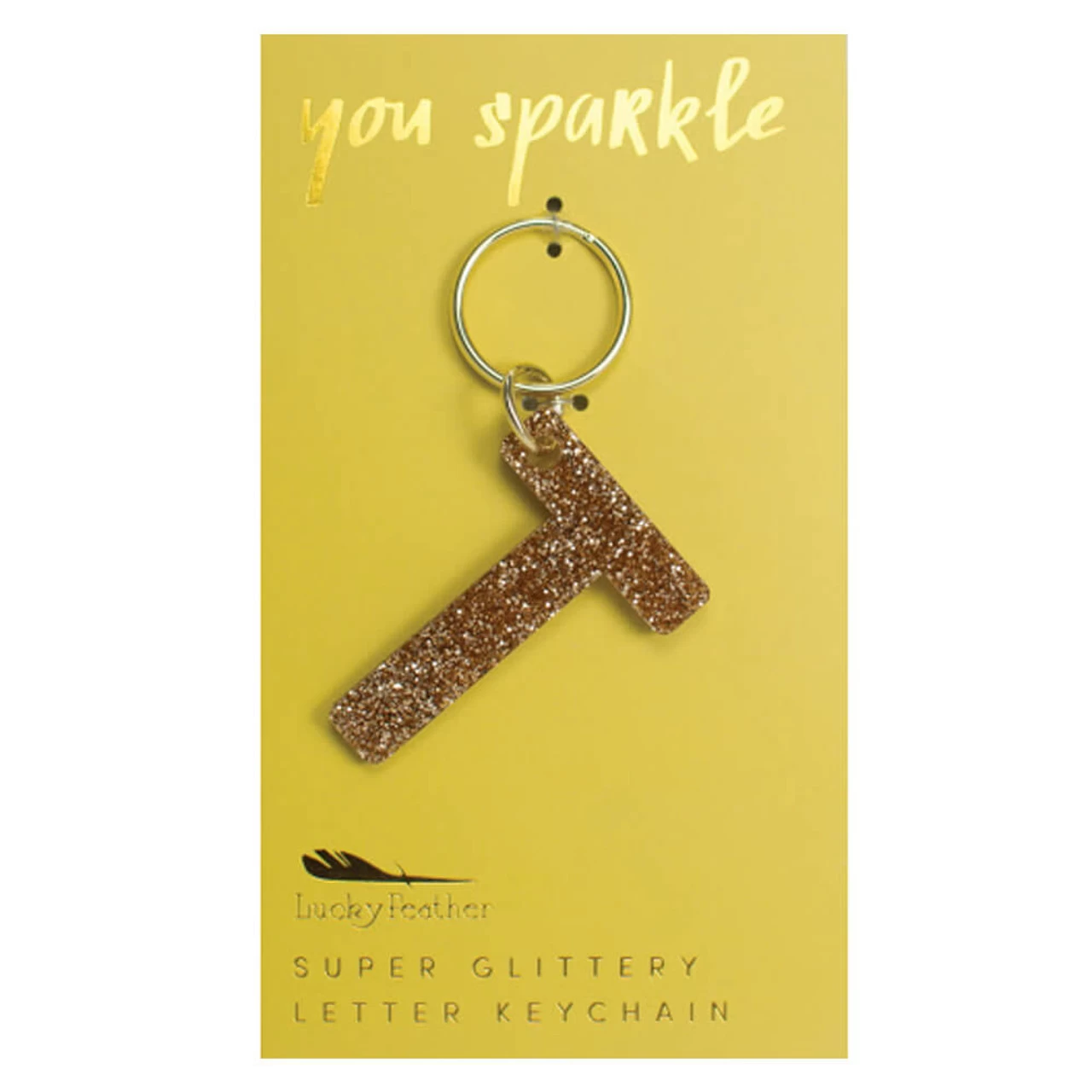 Proudly wear your initials with a gold glitter keychain. This acrylic letter T charm is perfect to personalize your bookbag or keys.