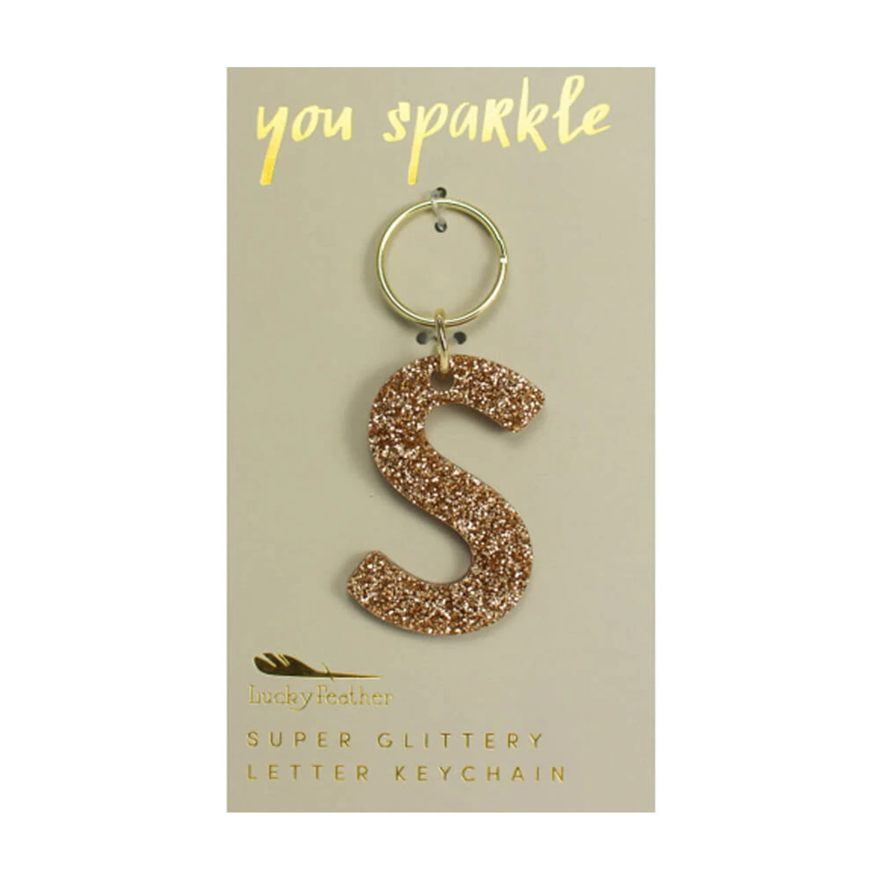 Proudly wear your initials with a gold glitter keychain. This acrylic letter S charm is perfect to personalize your bookbag or keys.