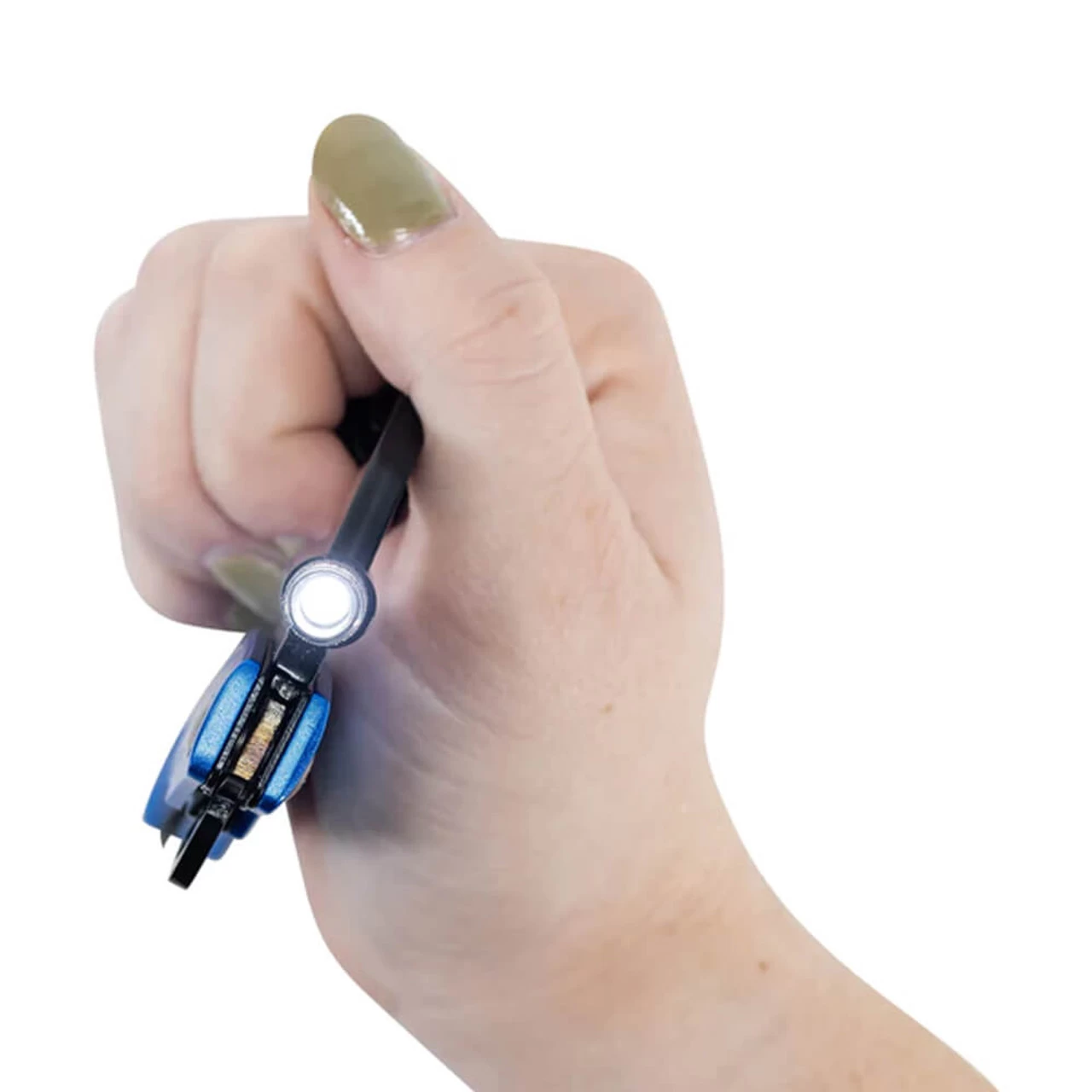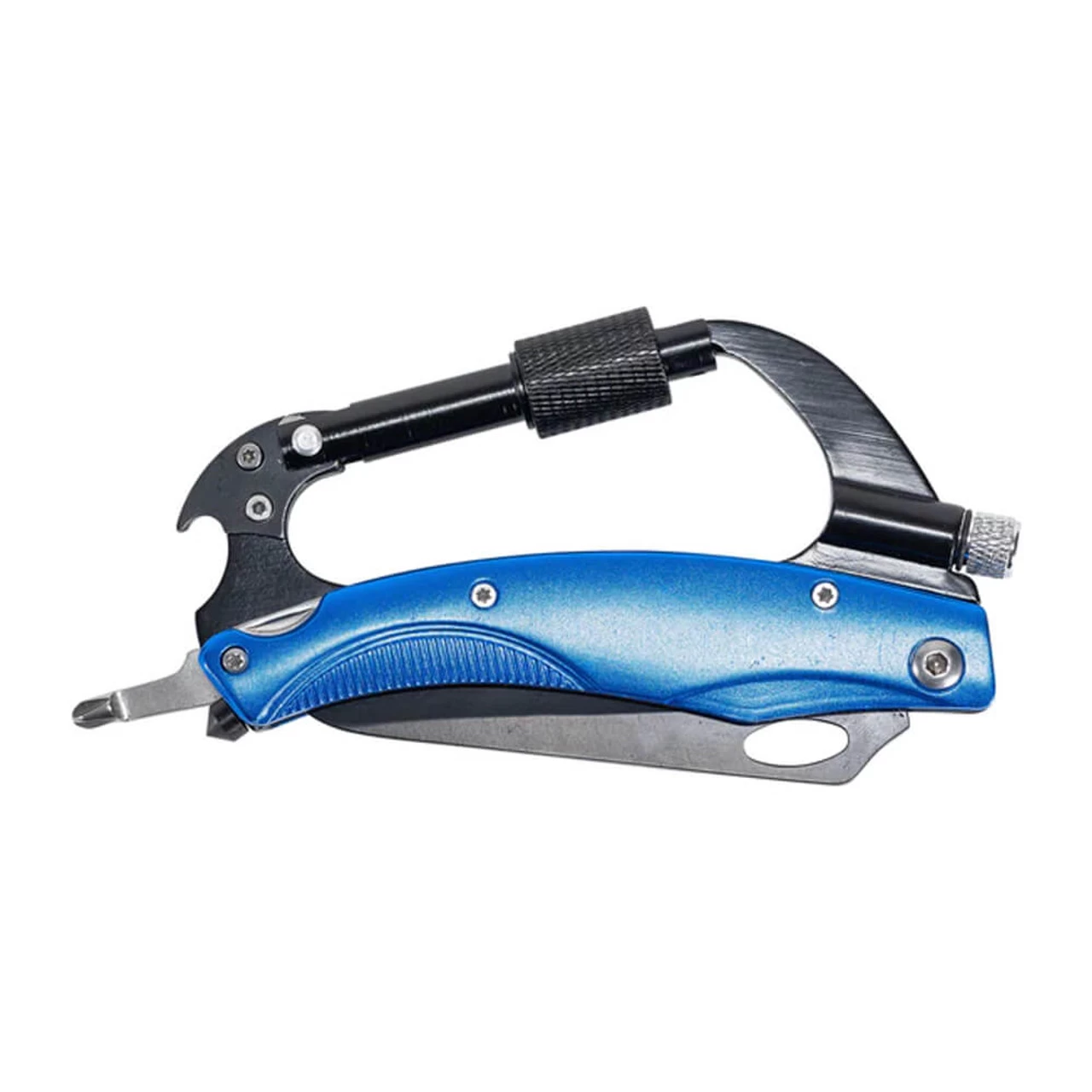 This multi-purpose tool is an essential. This carabiner tool includes a knife, LED light, hanging carabiner, phillips screwdriver, flathead screwdriver, glass breaker, bottle opener, side lock plate.