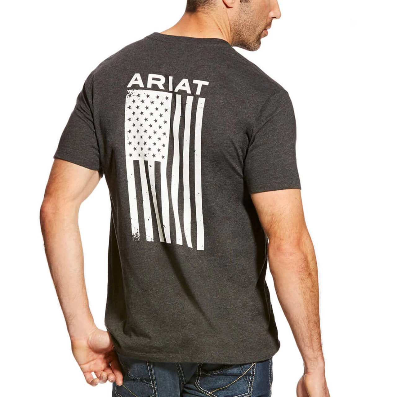 This men’s short sleeve charcoal grey t-shirt features the American Flag on the back and front left chest.