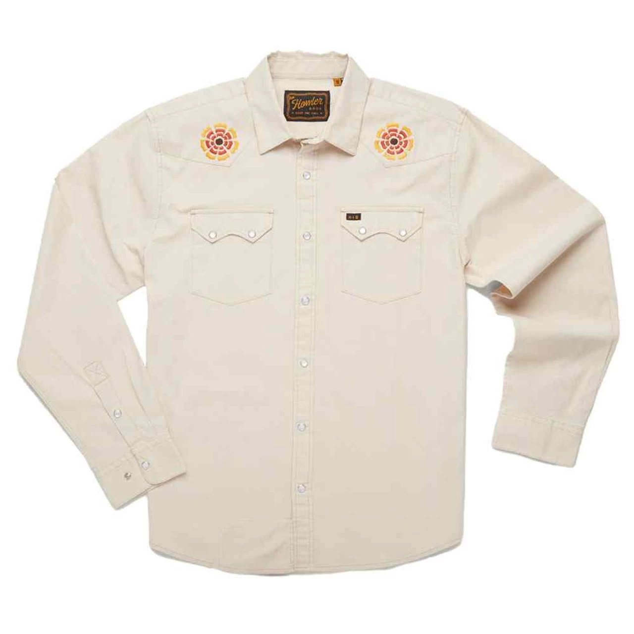 - Pearl snaps at pocket and placket