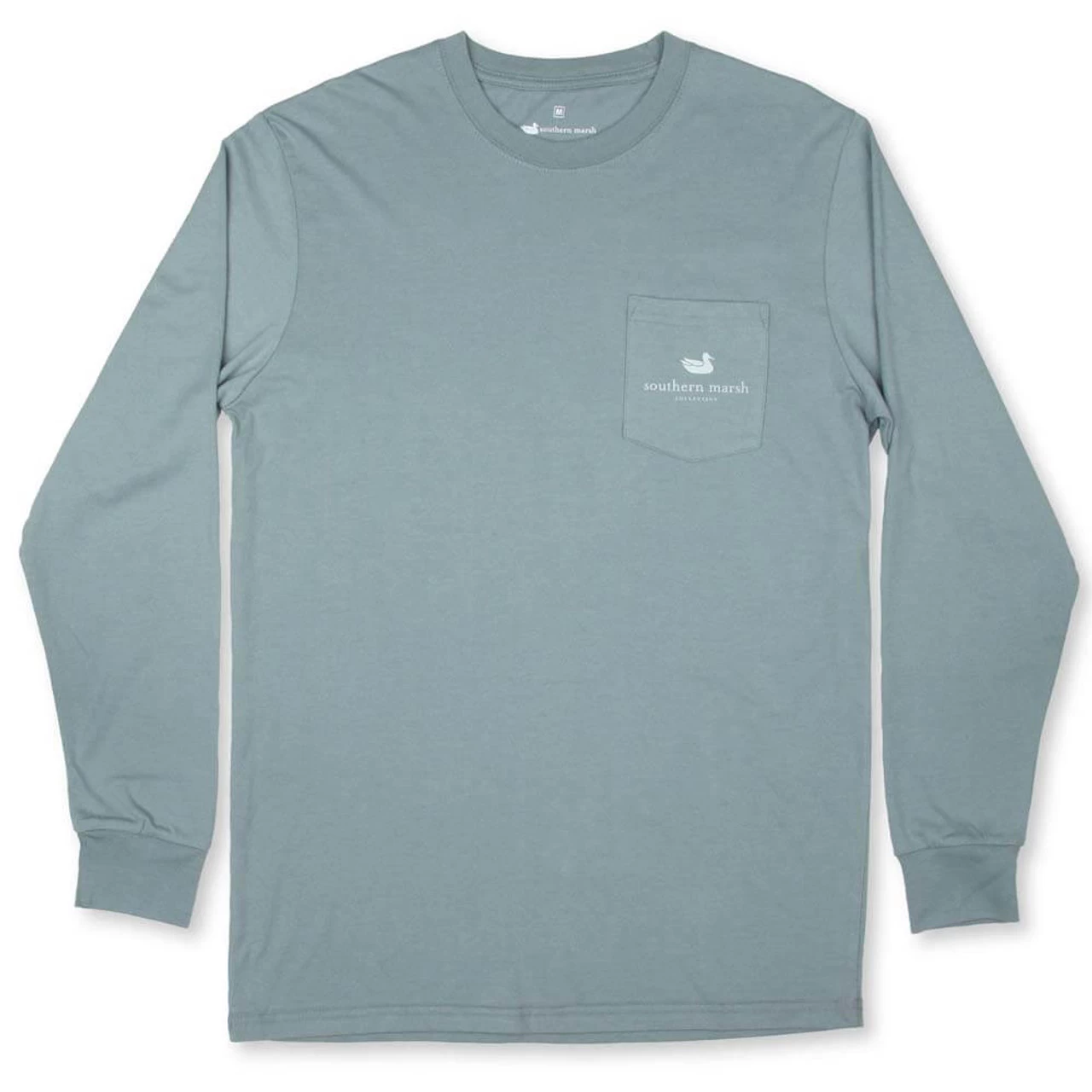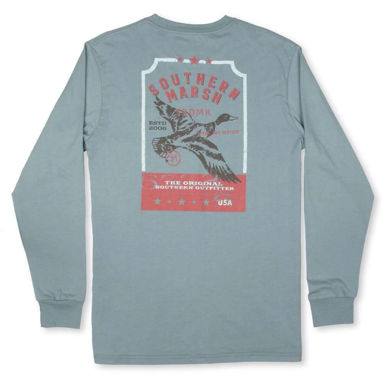 This long sleeve men’s t-shirt depicts a vintage tag logo with the Southern Marsh mallard flying in the center. Add this to your Southern Marsh collection.