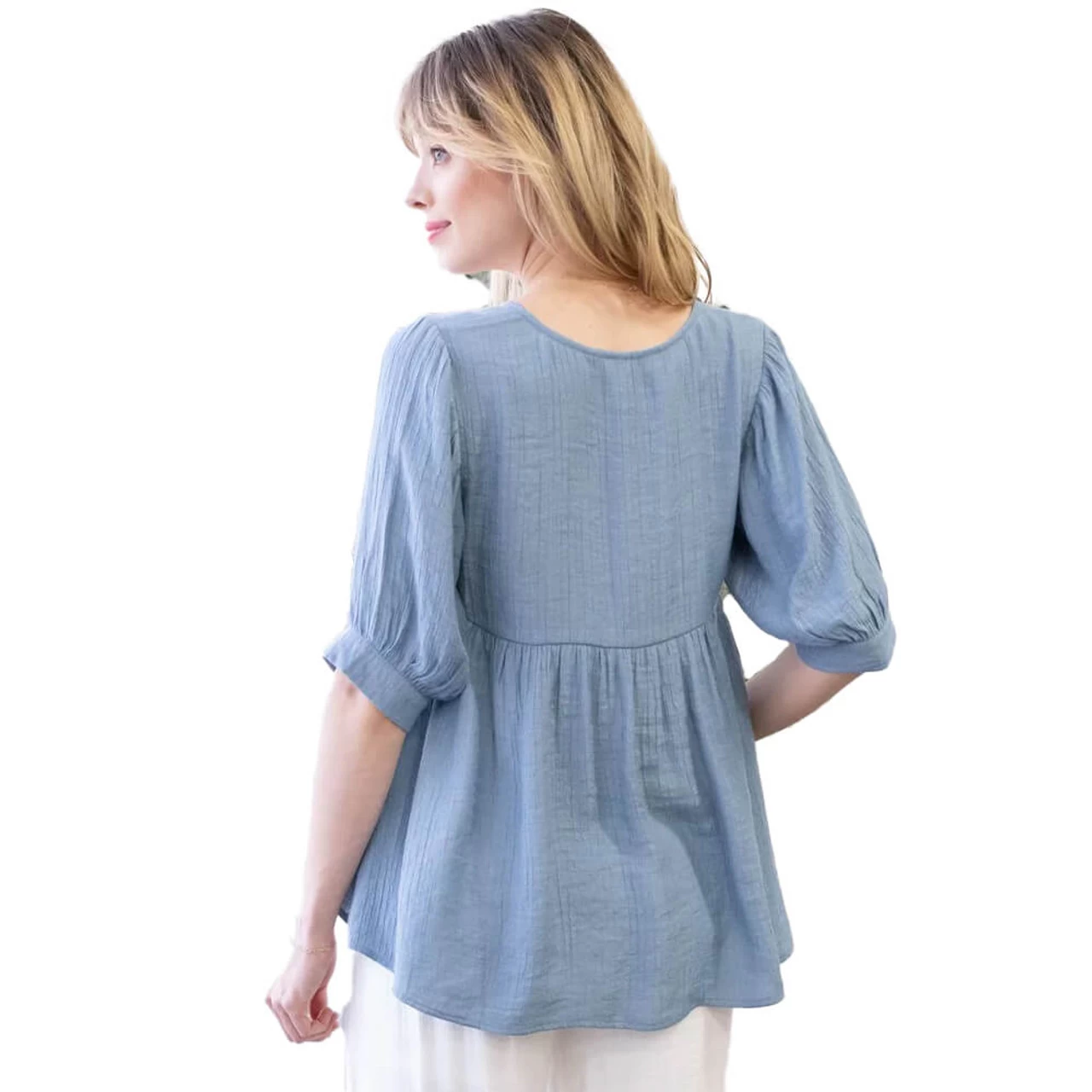 This relaxed woven blouse features stylish elbow length sleeves and is comfortable enough to be worn all day long.