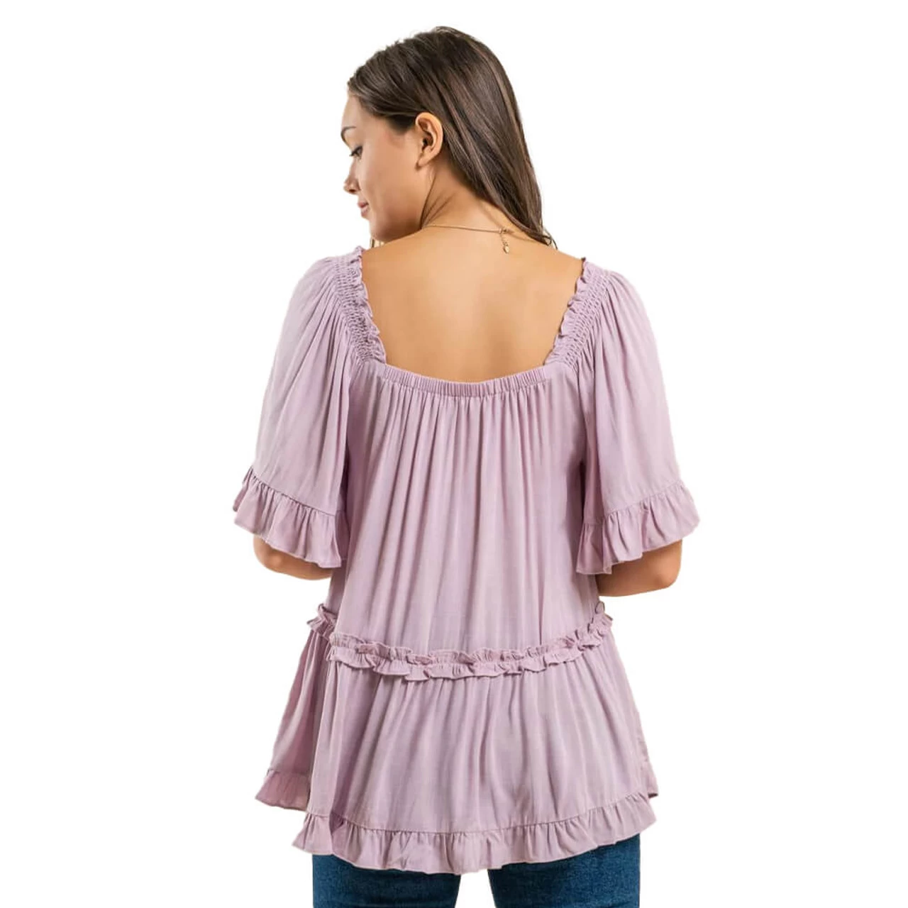 - Smocked shoulders and ruffled hem detail