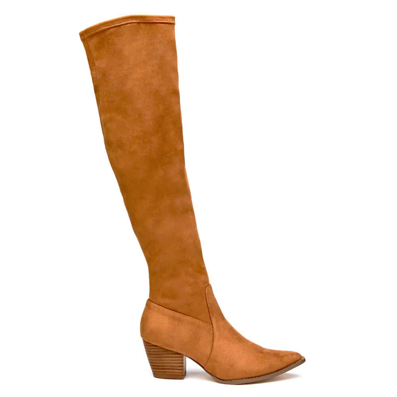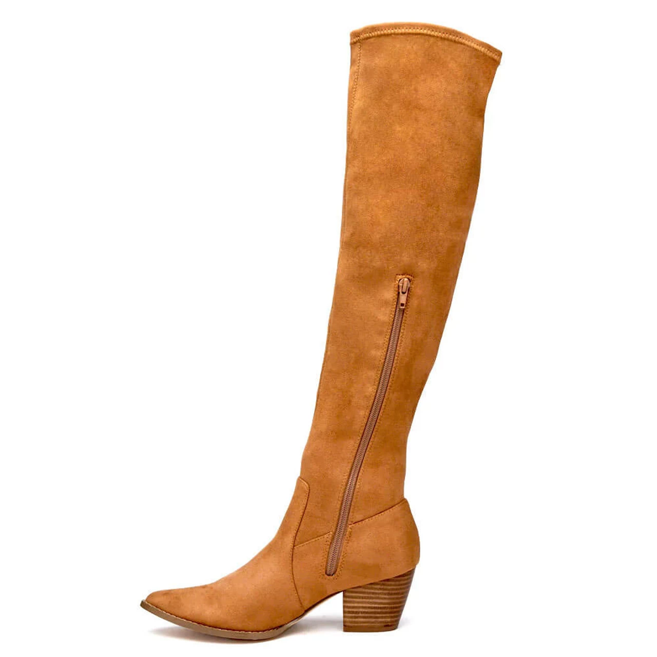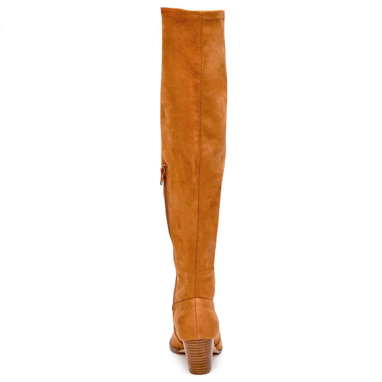 These stylish over-the knee stretch women’s suede boots make a great reason to wear your spring skirts into the fall.