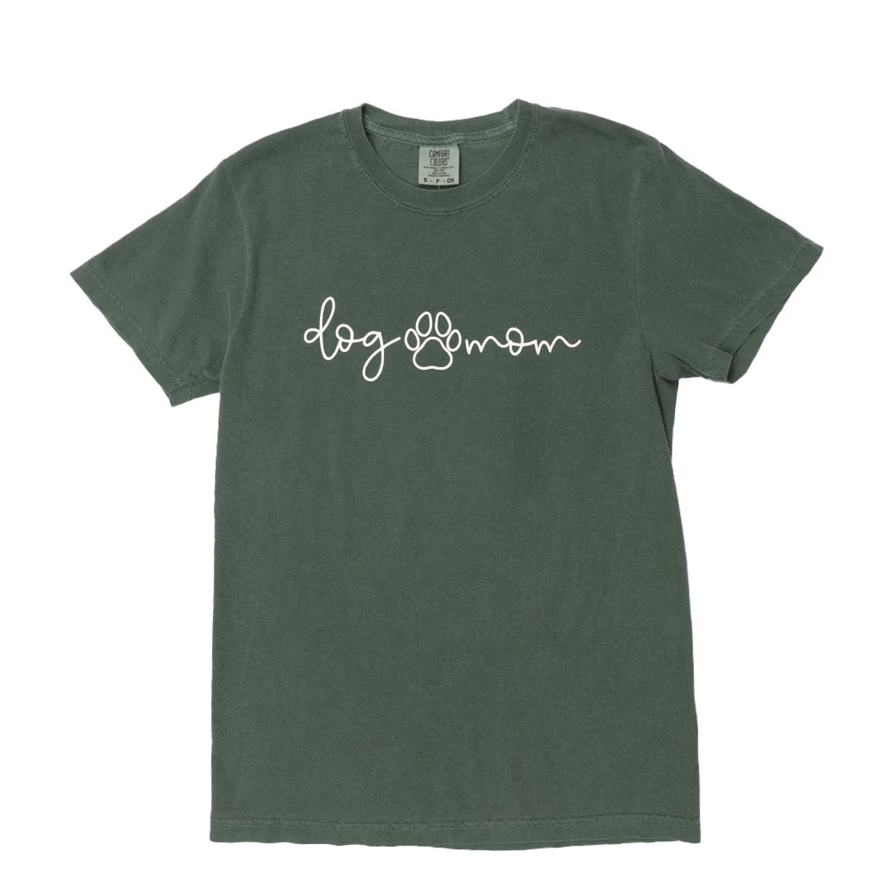 Perfect for any proud dog owner, this short sleeve tee features “Dog Mom” printed on the front in cursive with a little dog paw.