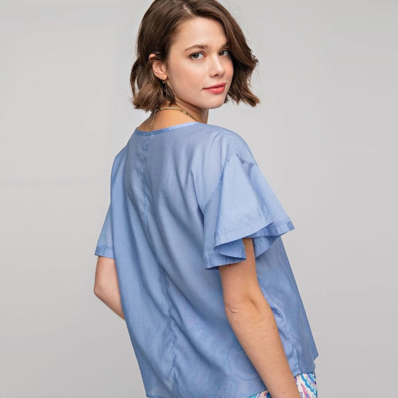This women’s ruffle washed satin top features a boat neckline and dropped shoulders.
