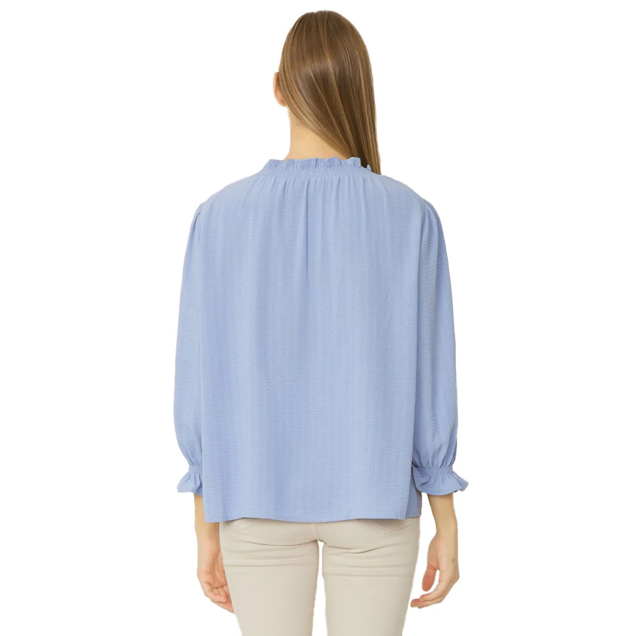 A solid material top that features ruffle detail on neckline and cuffs. Loose fitting and a slight v-neck, this shirt elevates your style.