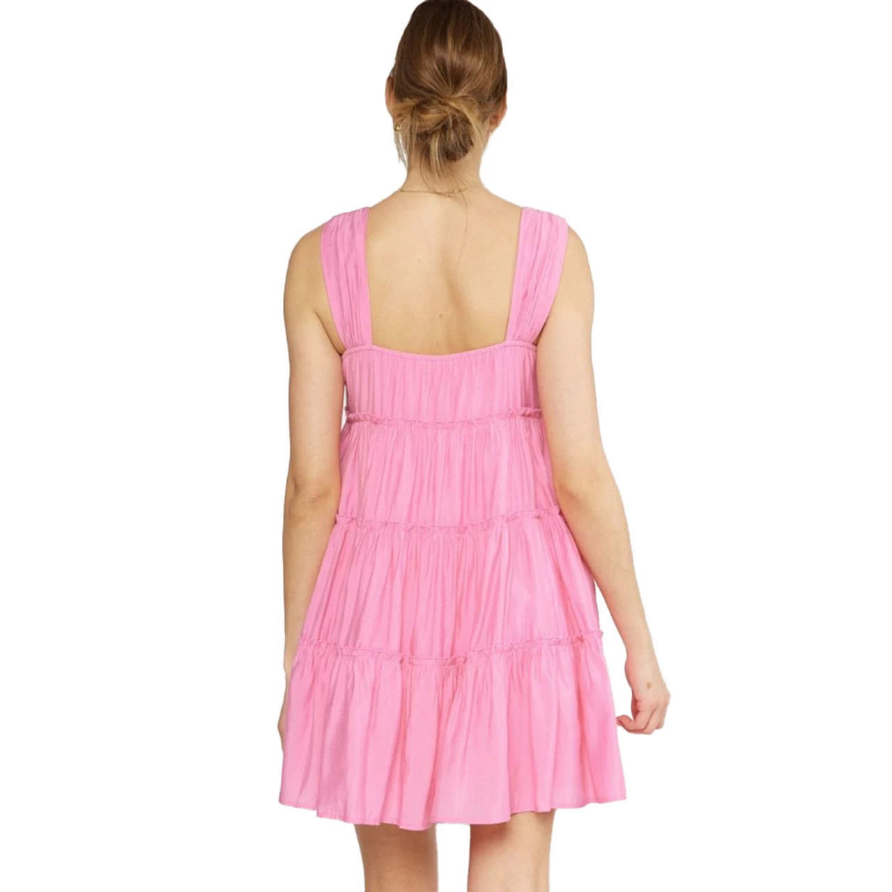 The perfect twirl dress, this square neck tiered mini dress features wide pleated straps and the right amount of ruffles at each tier.