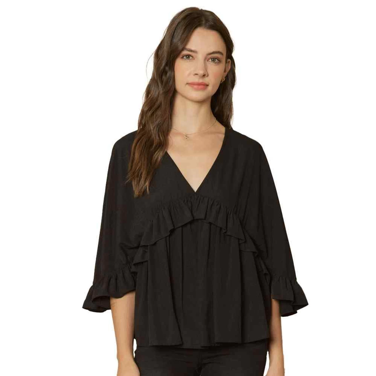 This lightweight and flowy top is pretty and an appropriate top for all occasions. The ruffles and 3/4 length sleeves flatter your figure and look great paired with your favorite skinny jeans.