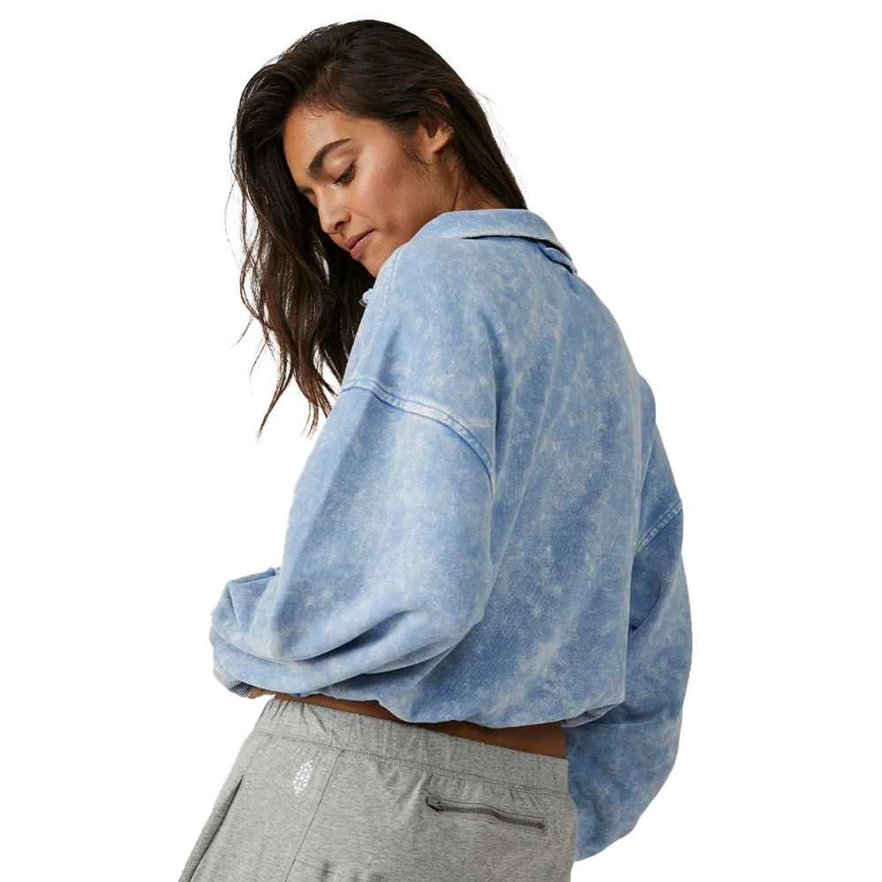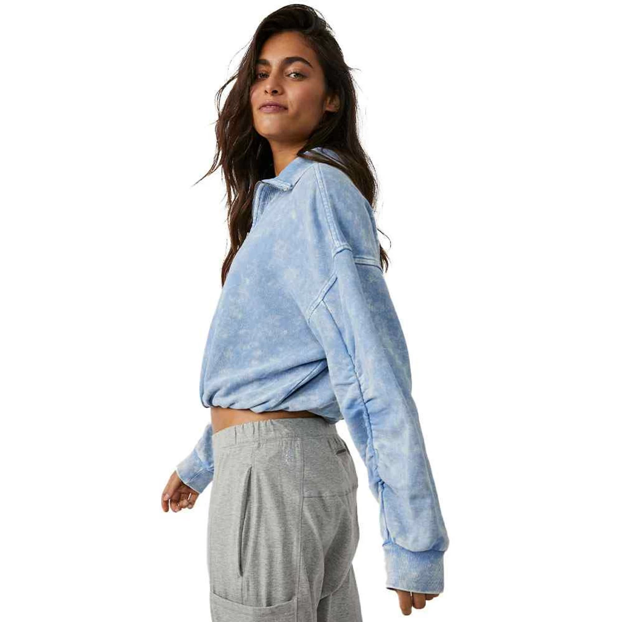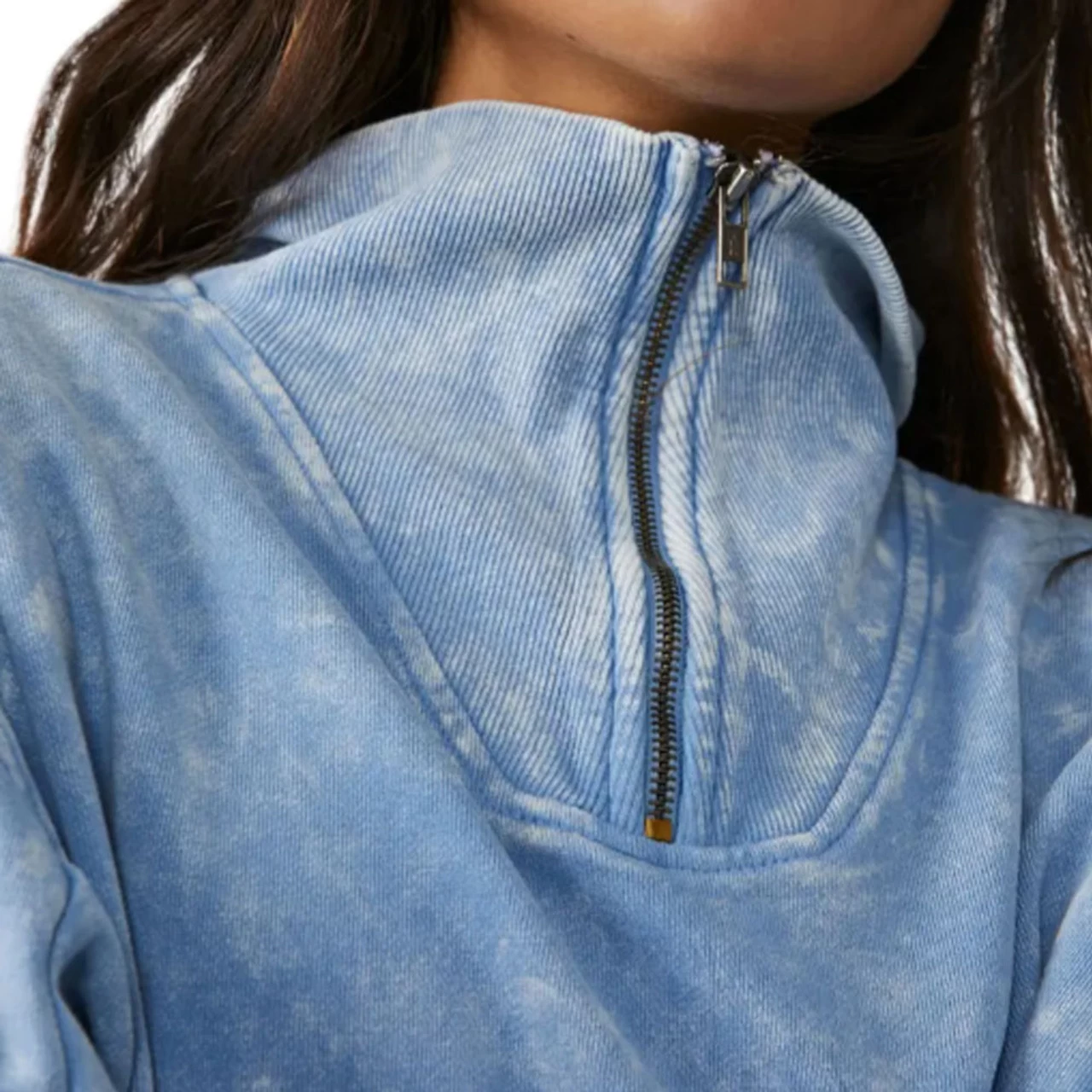 A comfortable relaxed fit cropped pullover that can be worn as a sweatshirt on those cozy Saturdays. Featuring a quarter zip ribbed collar, unique ruching details on sleeve and bottom hem, and roomy dropped sleeves.