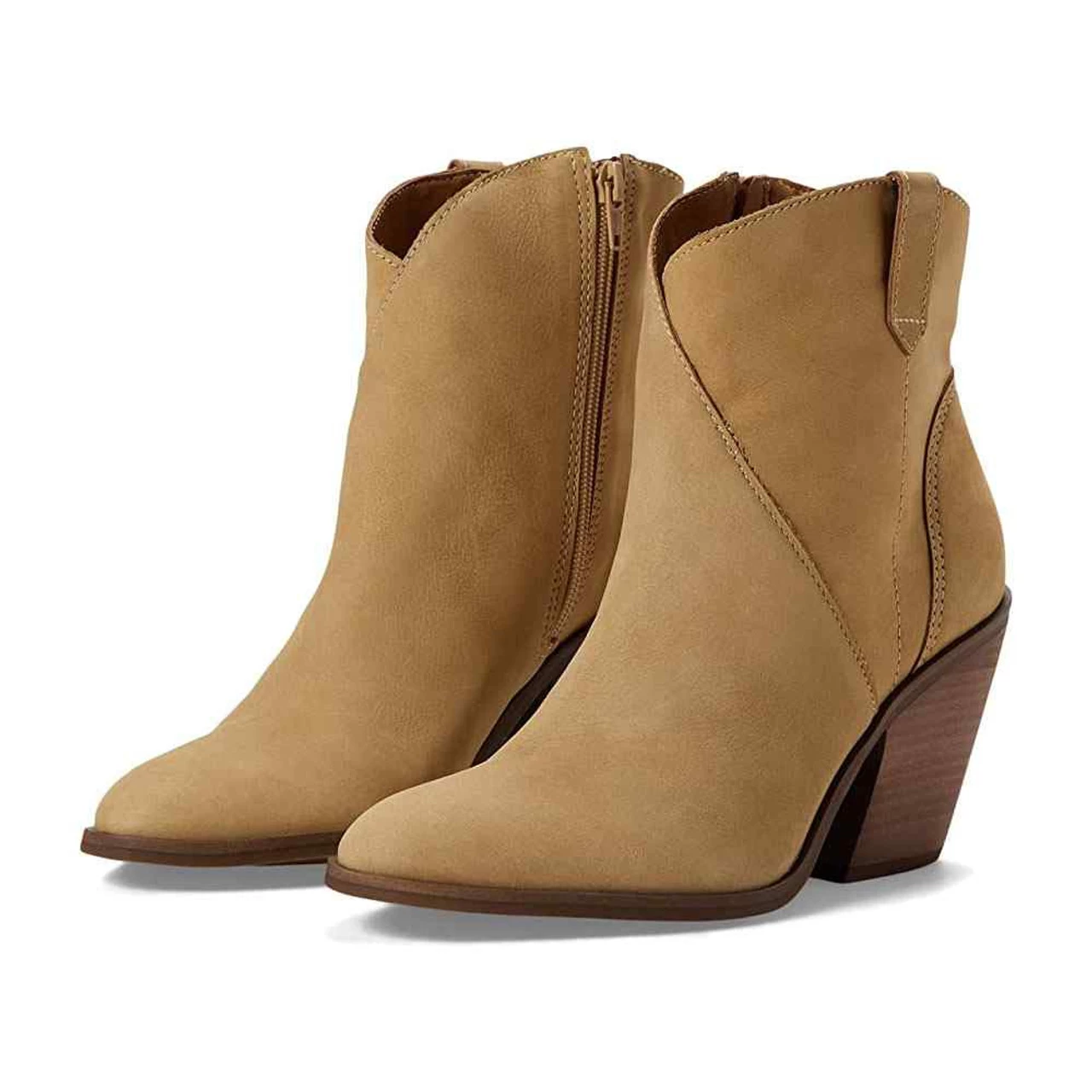 With a classic leather look and block heels, this pair of booties is a perfect pair to mix and match with your outfits. They look great with jeans or dressing up with your favorite party dress. The cross seam along the front gives it a touch of flare. They zip up on the sides for easy wear.
