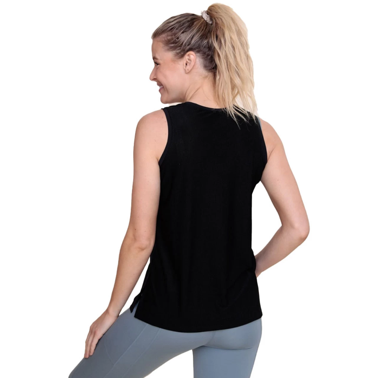 An overall breathable tank, it’s higher neckline, mesh fabric, and small side slits makes for a comfortable experience each time you wear it.