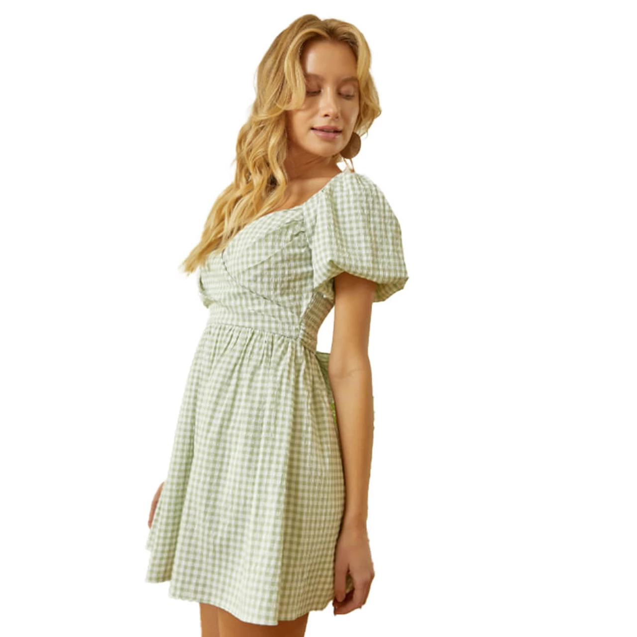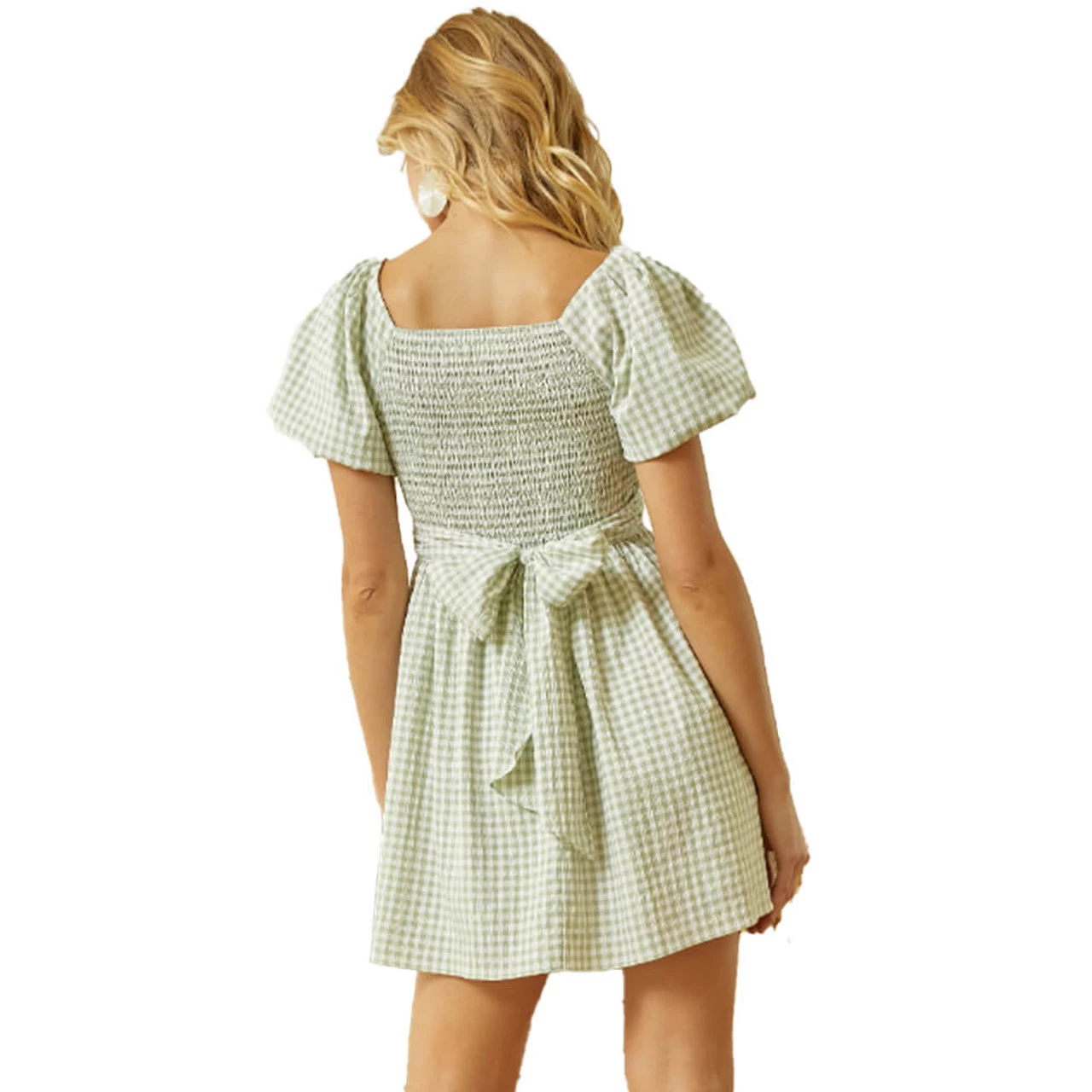 With puff sleeves and a stylish bow in the back, this adorable plaid dress by Mustard Seed will be sure to turn heads on your sunny day outings!