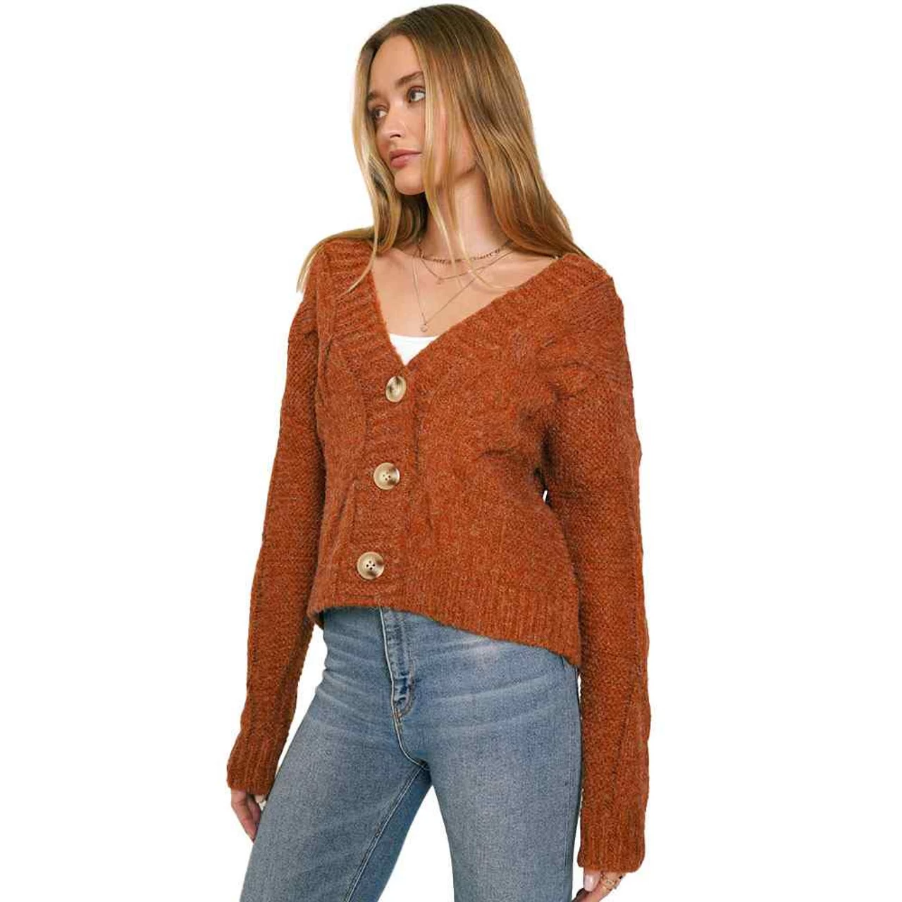 Keep warm with this cable knit cardigan. The rust colored fabric adds a pop of color to your wardrobe and stops at the waist. Layer and fix it closed with the brown and beige buttons displayed on the front to add dimension to the days outfit.