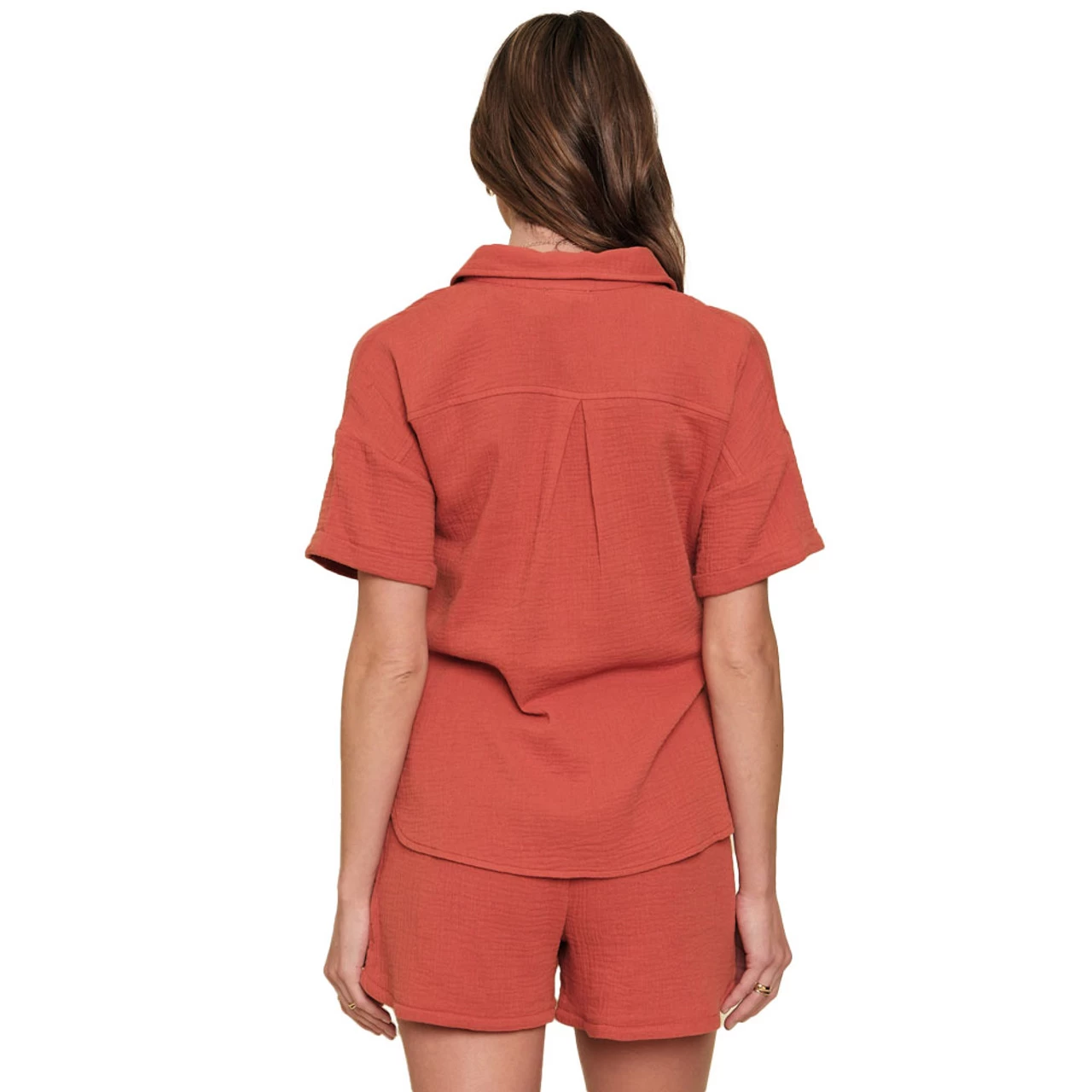 This linen blended collared shirt is easy to wear by itself or layered over a romper or tank top.