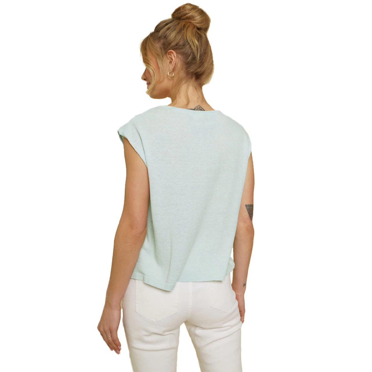 Capped sleeves, v-neckline and ruched front make up this sweater tank.