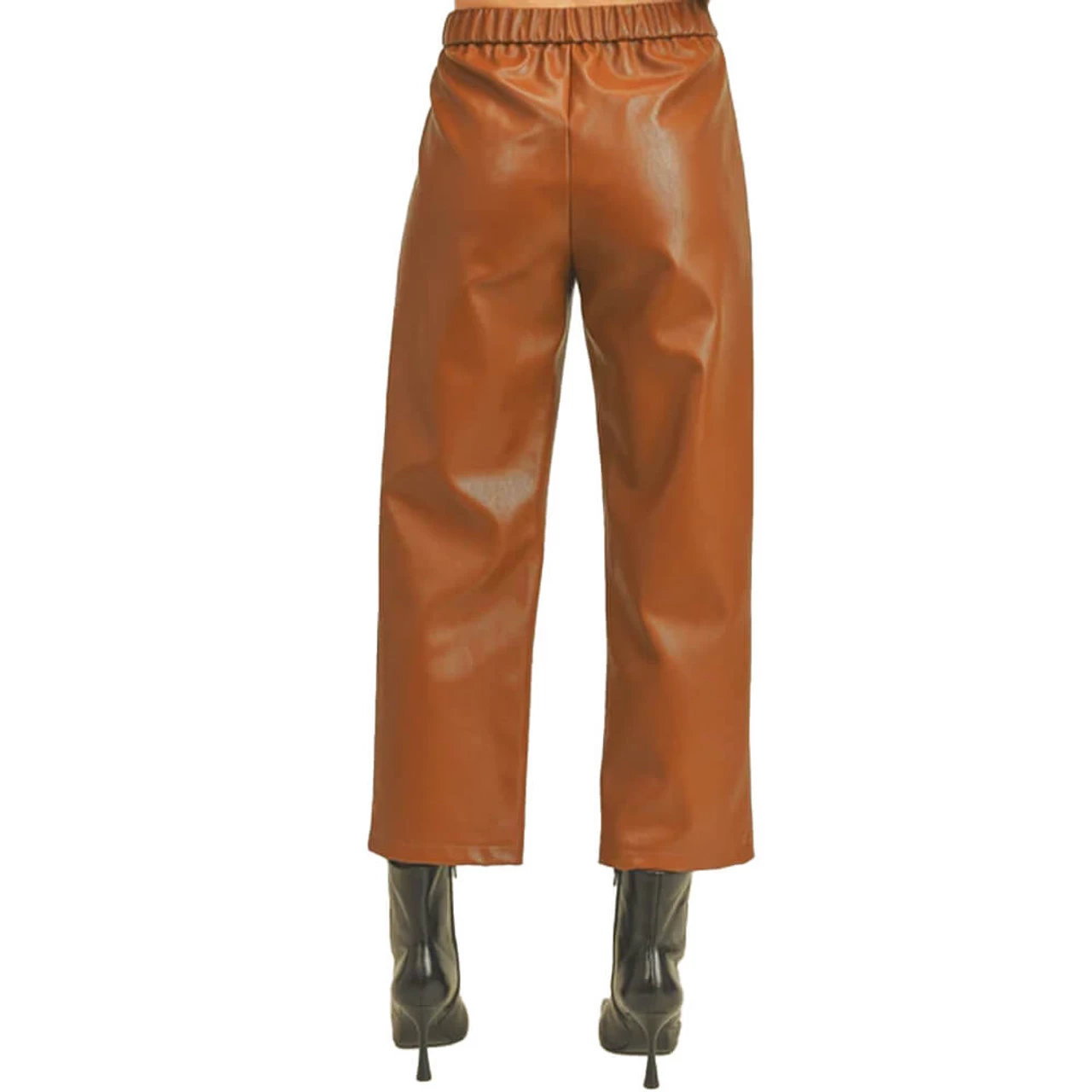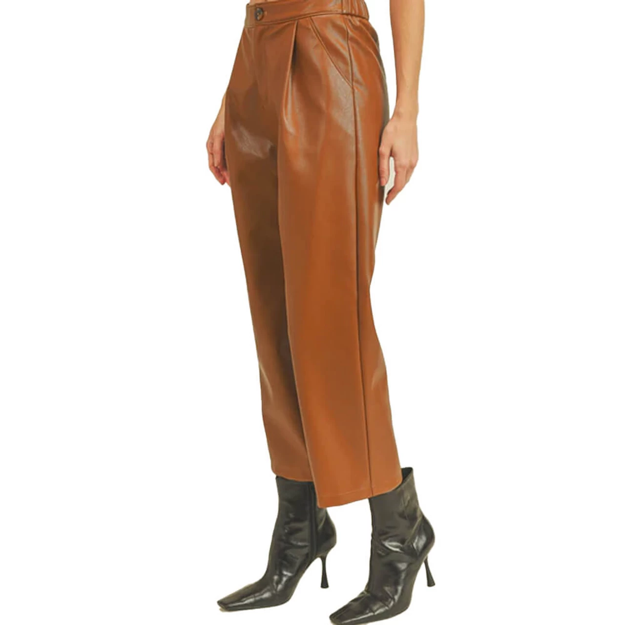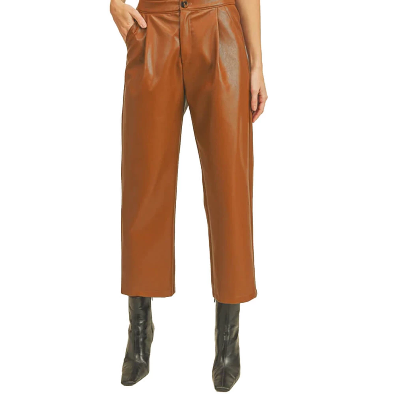 These straight leg pleather pants are sure to wow when you dress for success. They have a slightly shorter hemline and pleating details at the waistline. Pair with a sweater for the perfect autumn look.
