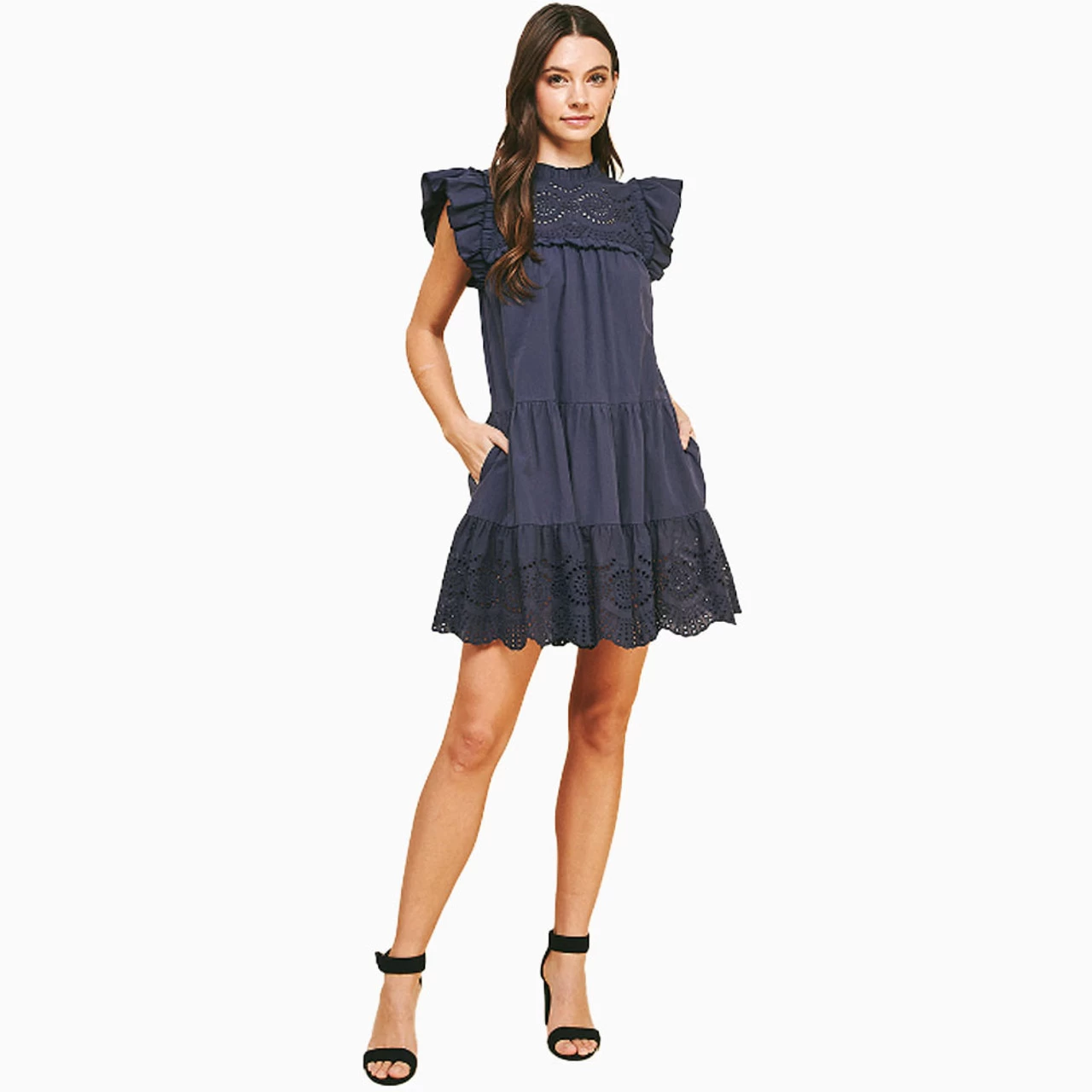 An updated vintage looking tiered mini dress featuring embroidered lace at the chest and bottom hem.