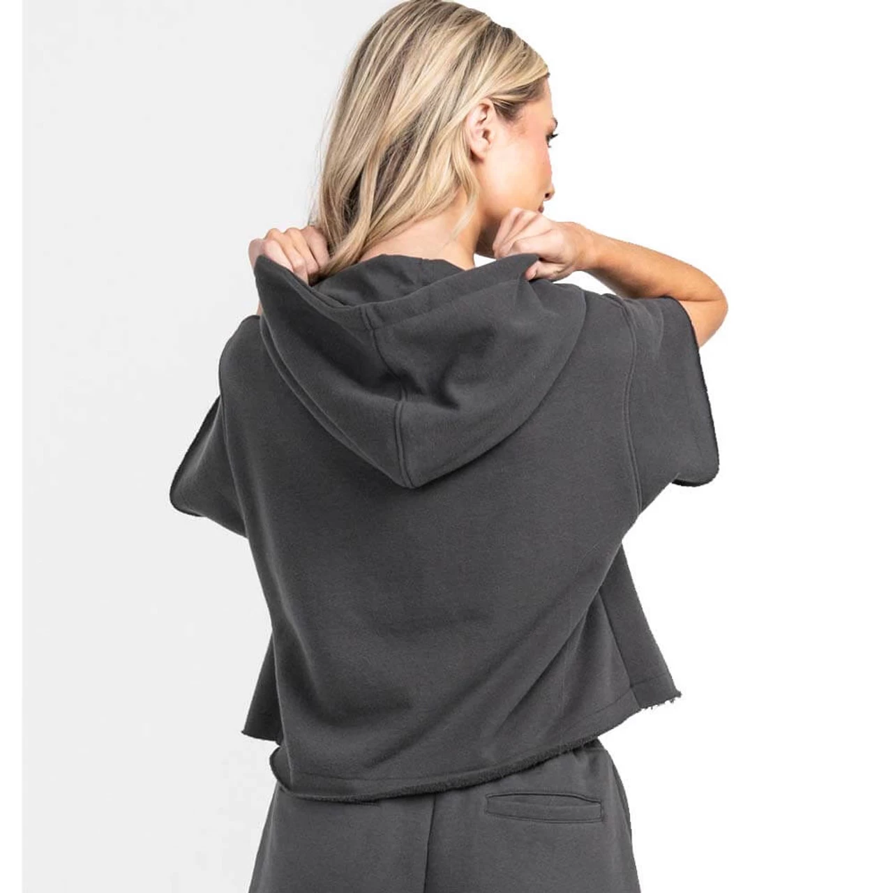 - Slightly cropped length with raw seam detail