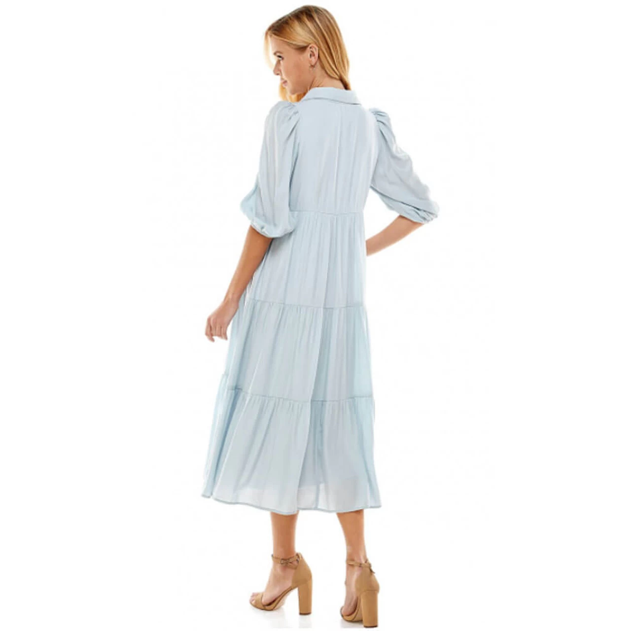 This midi dress features long puff sleeves and button up design for soft, elegant look. It would pair perfectly with sandals or a low profile heel.