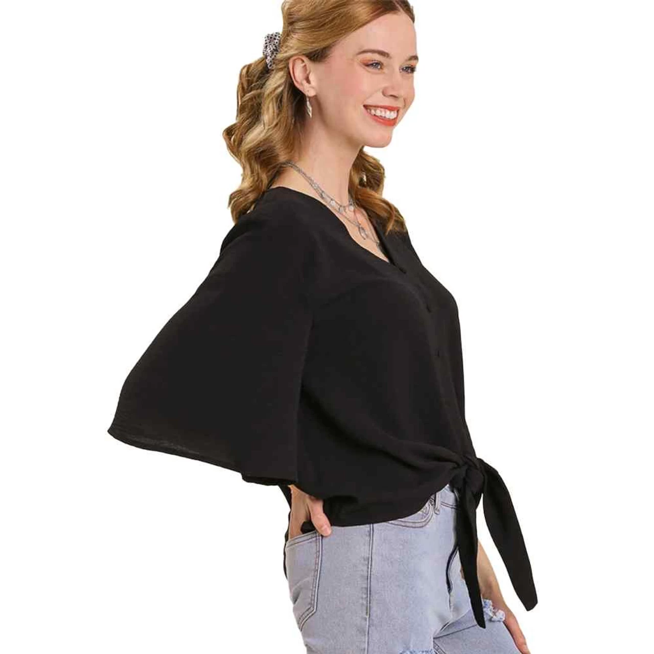 Casual and cool, this button down top features a tie front detail creating an illusion of a cropped look. Great for looking your best while you’re hanging out with the girls, the v-neckline flatters your figure and the sleeves fall just past your elbows. Pair with scalloped shorts or a skirt and sandals.