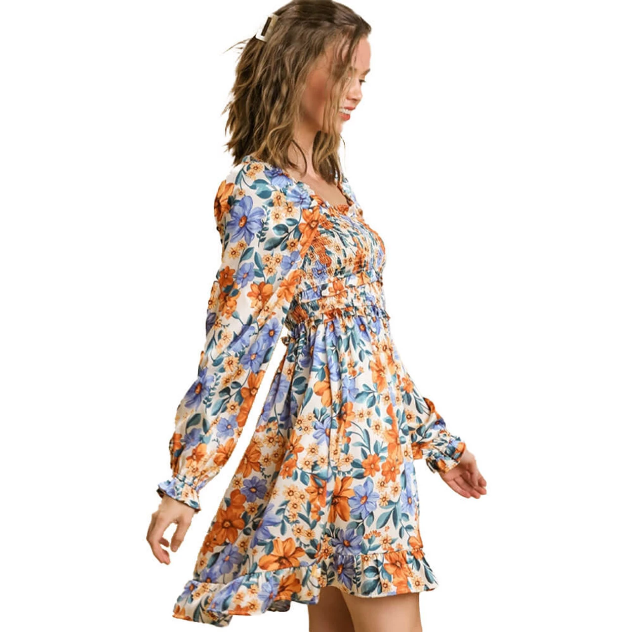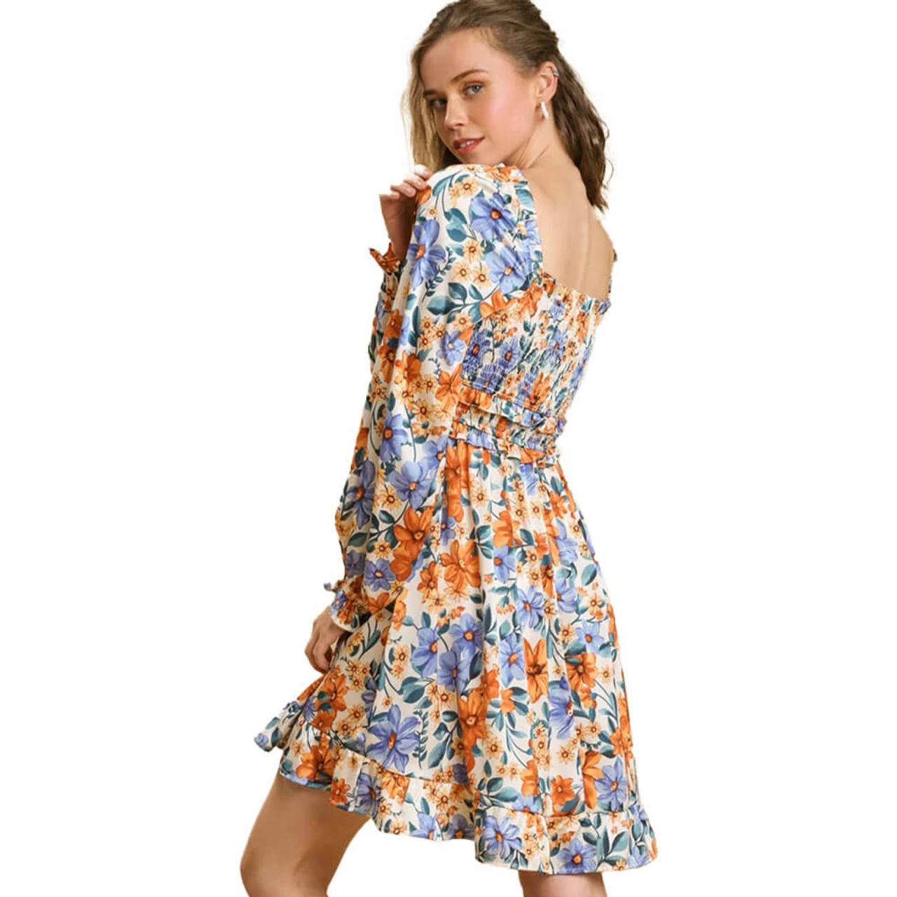 Ruffles and puff sleeve make for a dreamy vibe with this dress. The floral design and flowy skirt will make you feel feminine and beautiful. It features ruffles around the bodice and it is smocked so it fits just right everywhere.