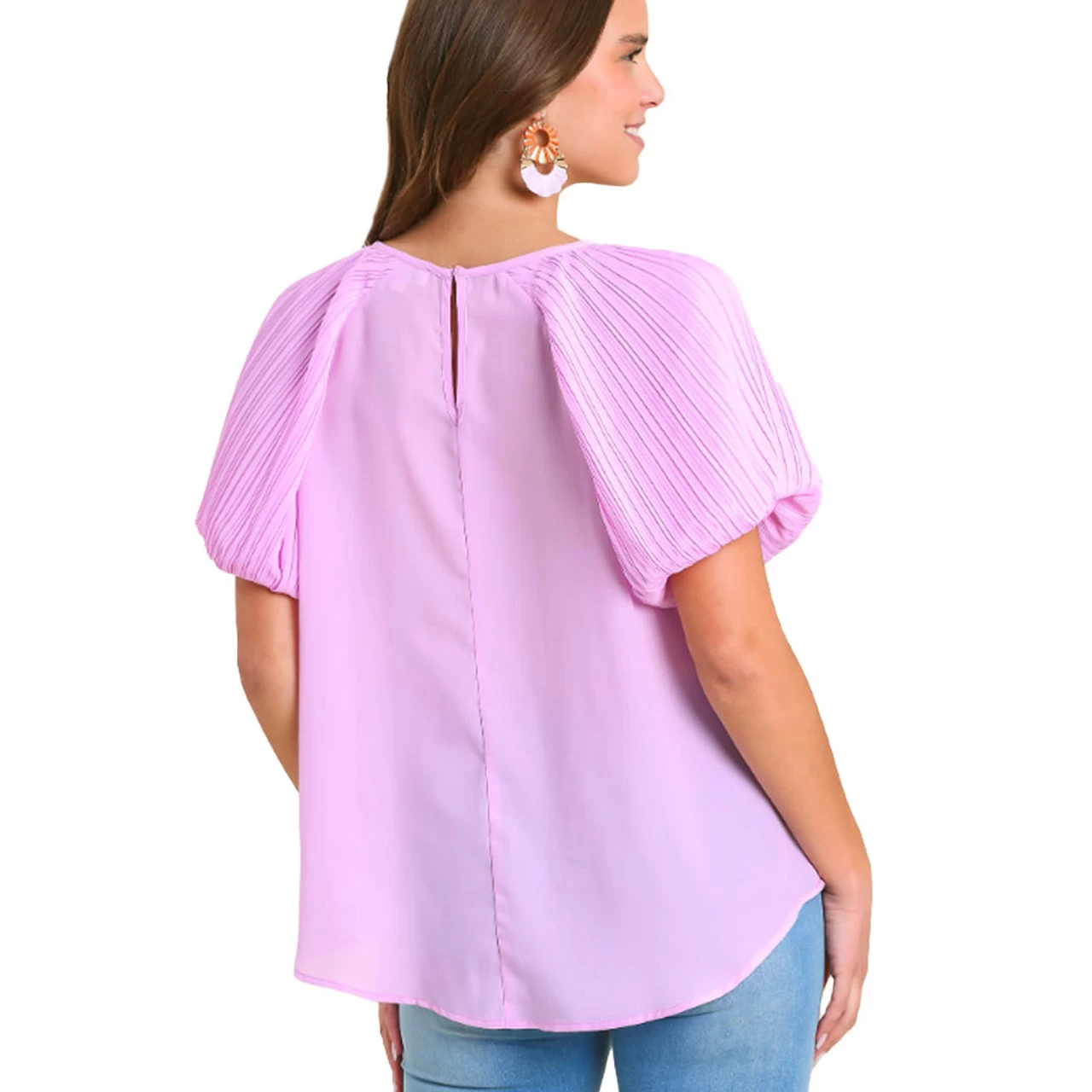 Add a little flair to your top collection with this pleated balloon short sleeve shirt with a round neck and keyhole button back detail.