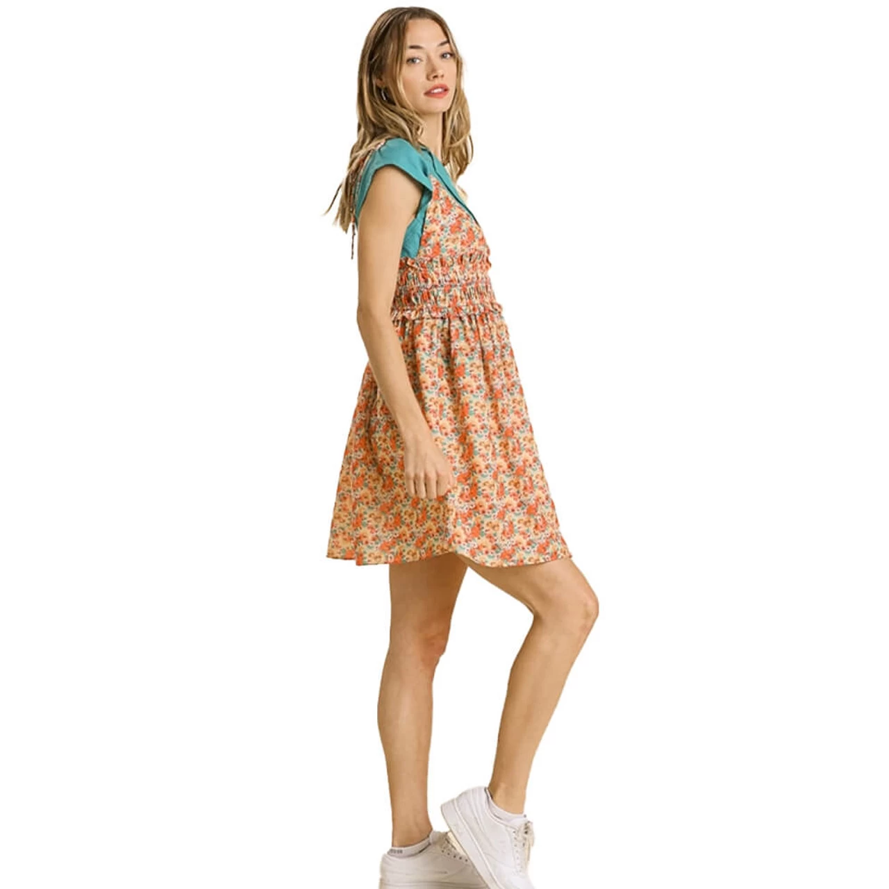 With a floral print, fitted smocked waist, and tied spaghetti straps, this dress provides its wearer with a shapely option to wear. The hemline is rounded to provide the look of longer legs.