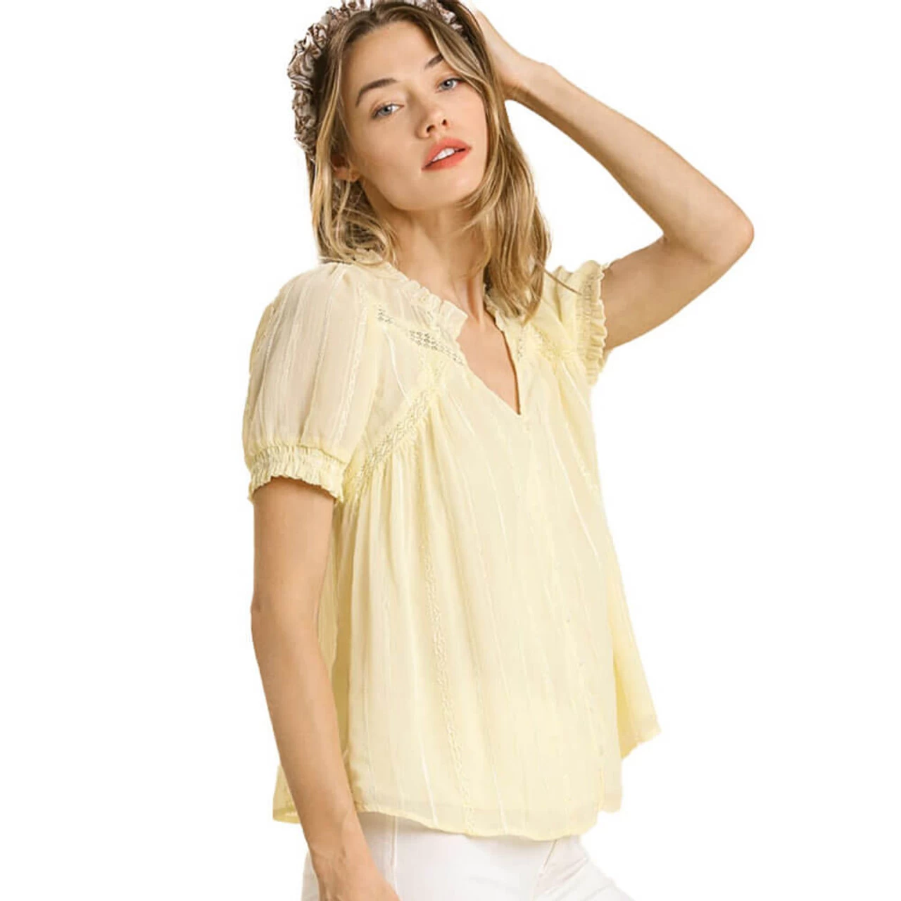 Sweet and stylish, this lace trim top has capped puffed sleeves and is appropriate for work or school. It looks best with flared pants of any kind and boots. It has a ruffled neckline and buttons down the front.