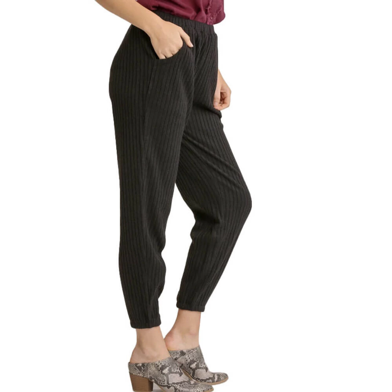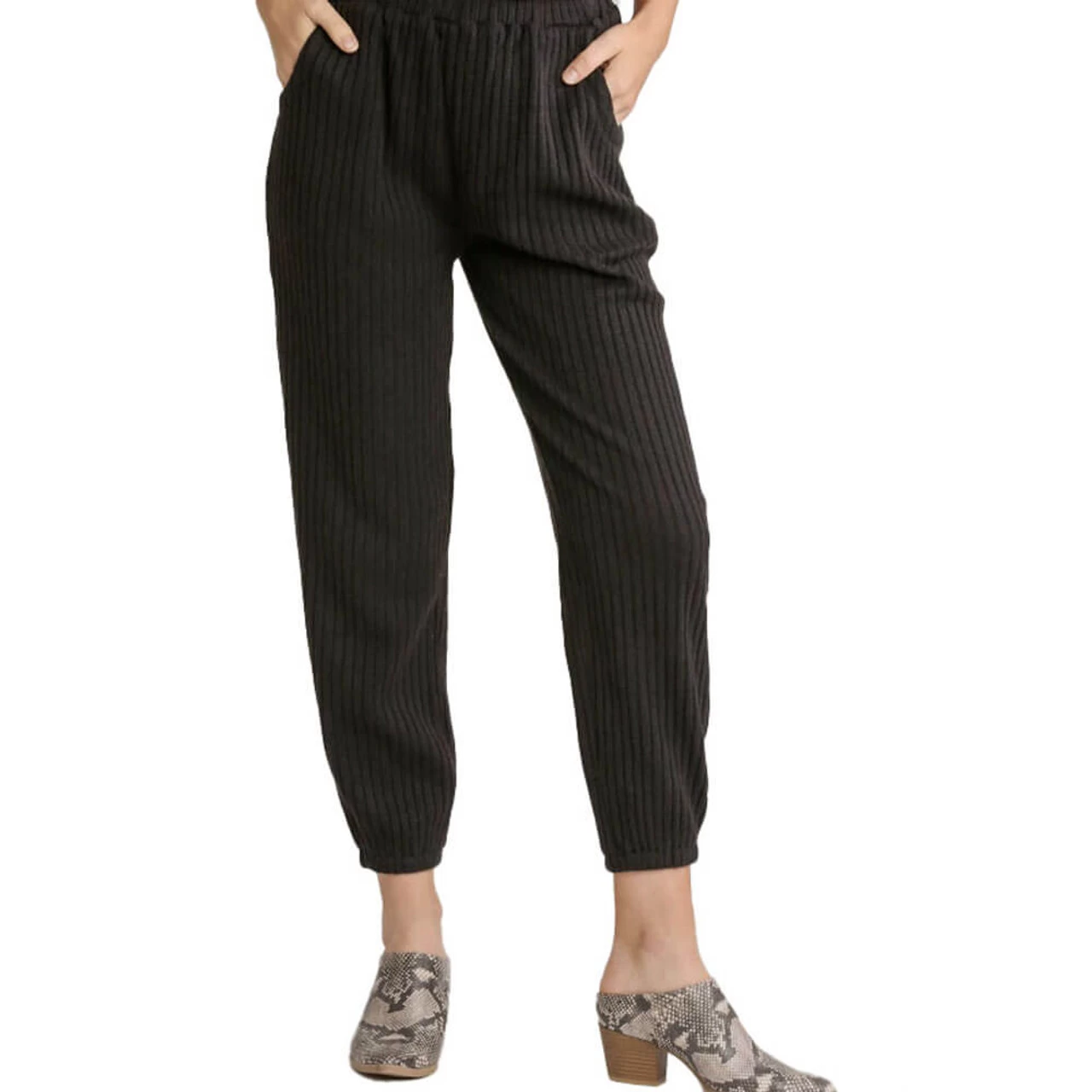 Part of a matching set, these joggers are great for working from home or going out to run errands. They are ribbed and have elastic in the waistband and and in the legs. They even have pockets.