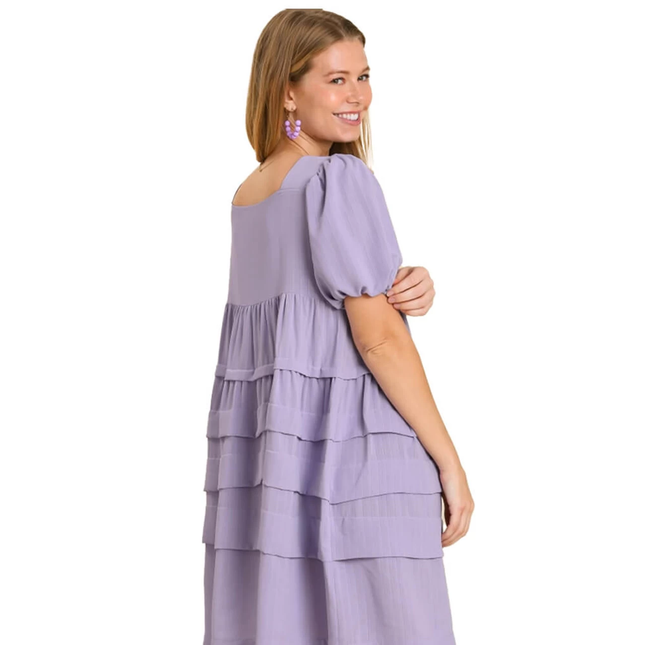 Featuring pintuck tiers, a square neck and puffed sleeves, this flowy dress is a great staple for your closet. The light fabric is comfortable and you’ll be dancing all night wearing this. Pair with sandals for a summer dressy look.