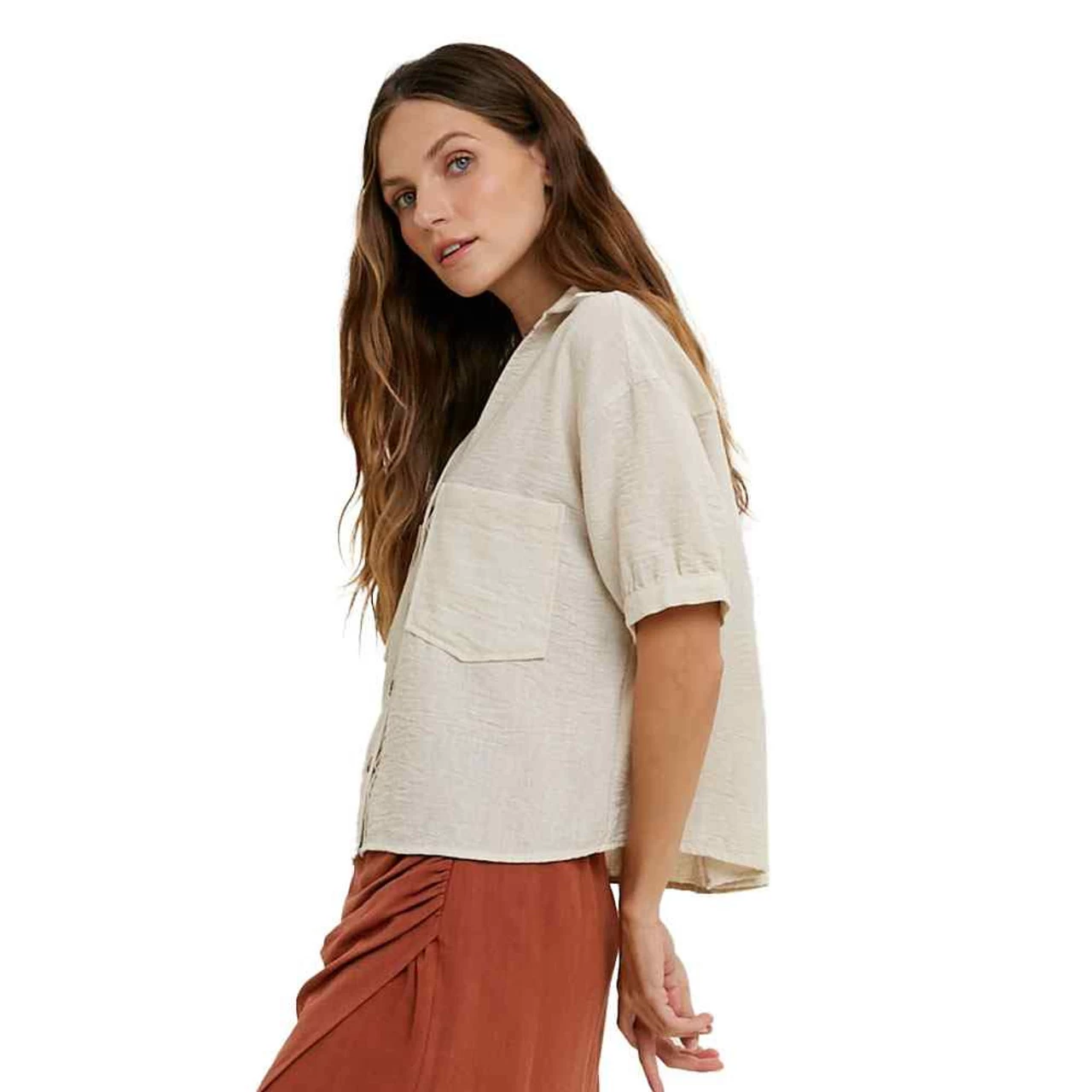 This textured relaxed crop blouse is so cute and comfortable. Lightweight and breathable, this button down top is a must have for your spring wardrobe.