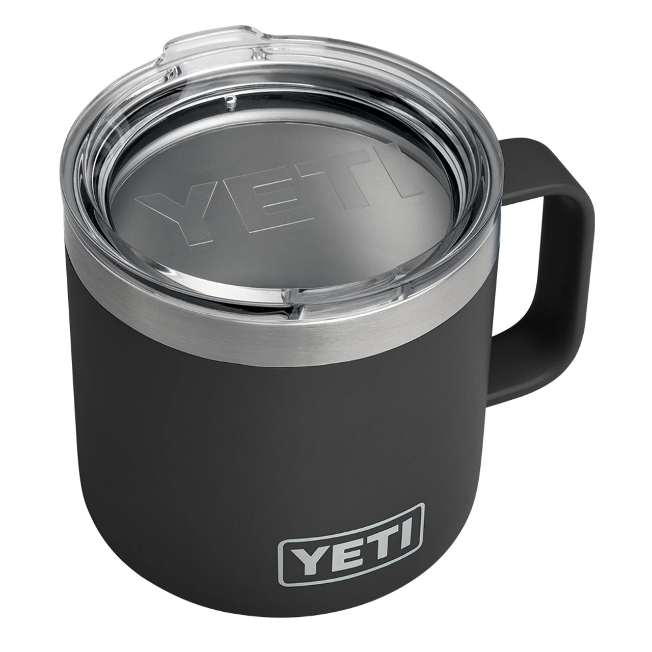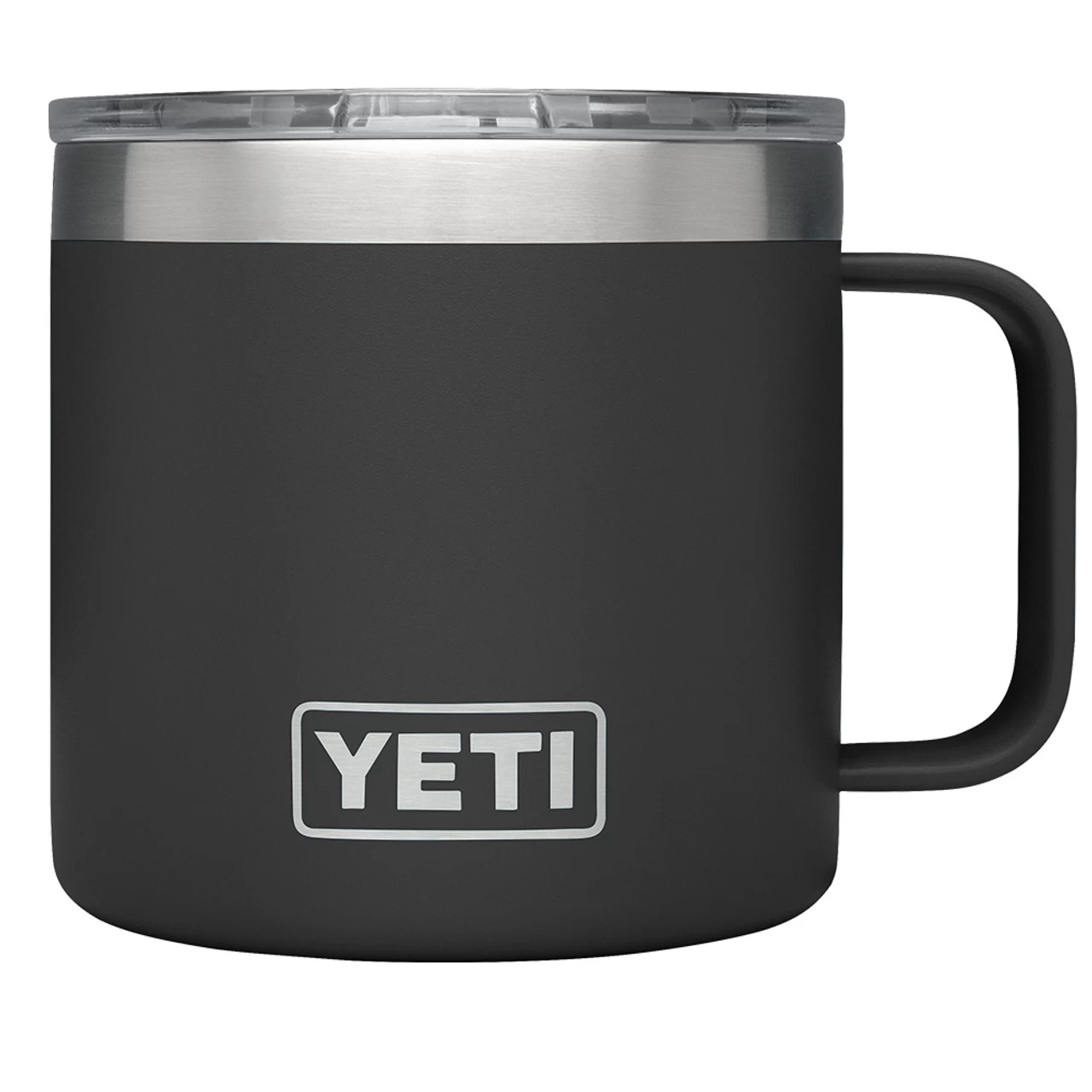 The black Rambler® 14 oz. Mug is the toughest insulated travel mug out there. Unlike traditional camp mugs, Yeti’s mugs are made with a double-wall vacuum-insulated body the protects hands while keep cold items cold and hot items hot.